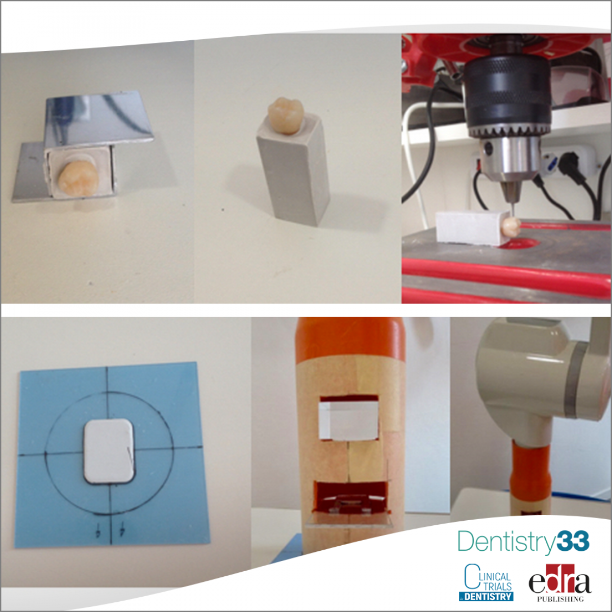 For the study, 9 posterior teeth extracted for periodontal reasons with intact crown and roots were used. Each tooth was mounted in a plaster support. At the mesial and distal aspect of each crown, two artificial cavities (one on each side) were made using cylindrical burs of different diameters, which were mounted on a calibrated milling machine. The study was conducted on a total of 18 artificial interdental cavities. For each tooth, radiographs were then taken with each of the following radiographic systems: analogic, PSP, and CCD. Two radiographs were taken with each system: one with the interposition of plexiglass between the X-ray tube and the radiographic device to simulate the presence of perioral soft tissues, the second without the interposition of plexiglass. Analogic radiographs were digitized. Each digitized analogic image as well as each radiographic image obtained with either PSP or CCD systems was calibrated. On each image, a calibrated and blind operator measured the apico-coronal (height) and mesio-distal (depth) dimensions of each cavity.
