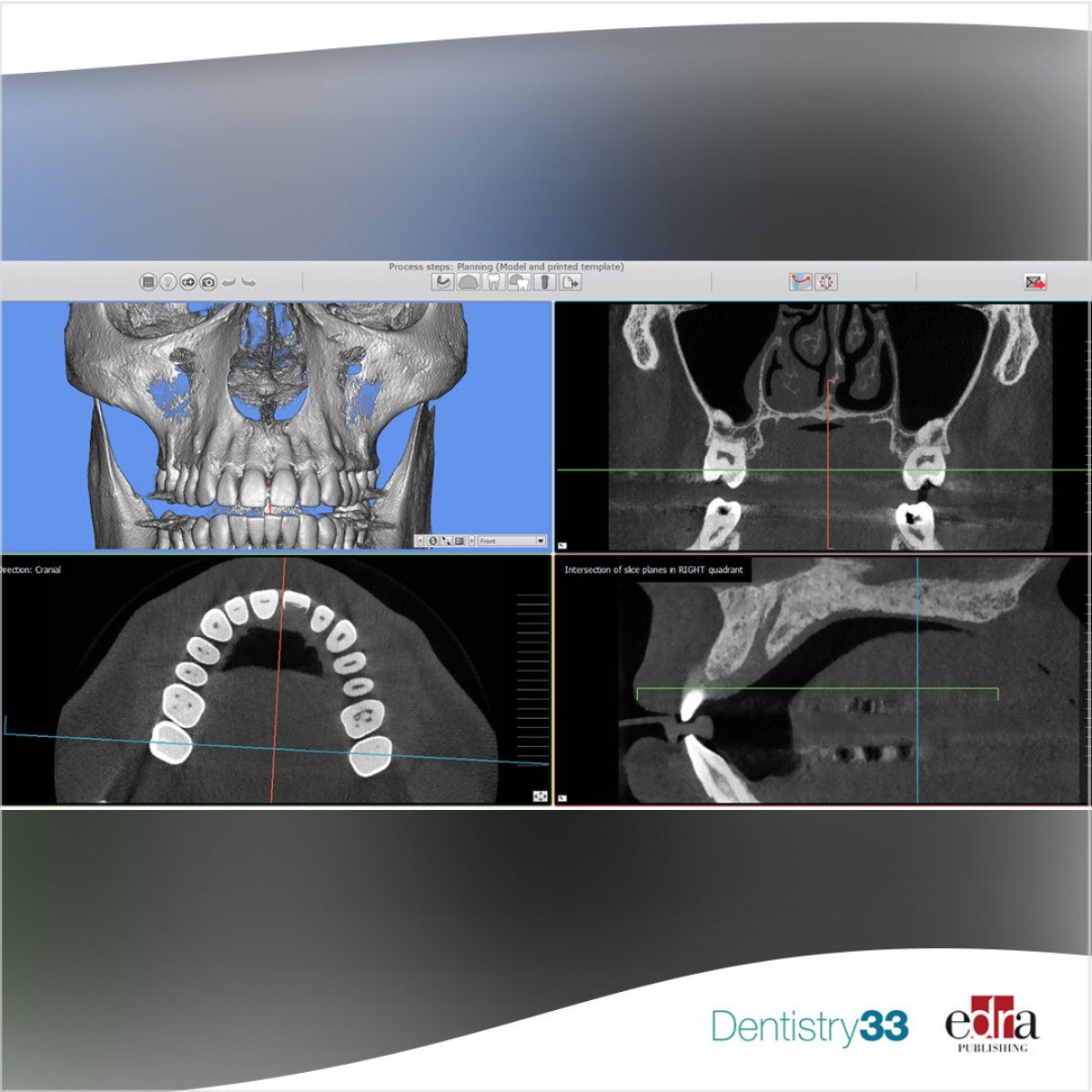 After data collection, a digital application (DSDApp, LLC) was utilized to create a 2D facially driven smile frame which showed the need for surgical crown lengthening to improve the esthetics. Clinicians conducted a cone-beam computed tomography (CBCT) exam and a 3D digital diagnostic wax-up were required for the perio analysis and surgical planning.