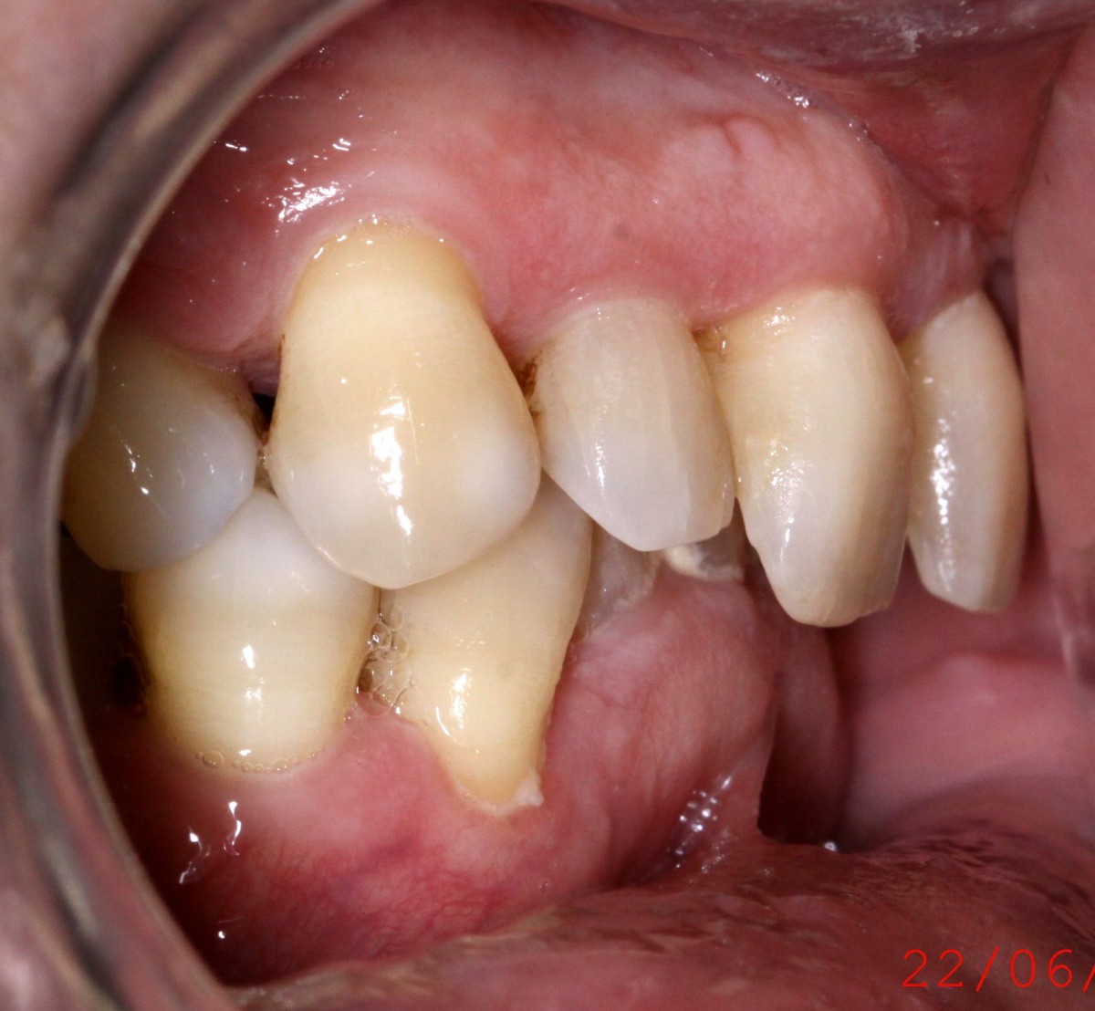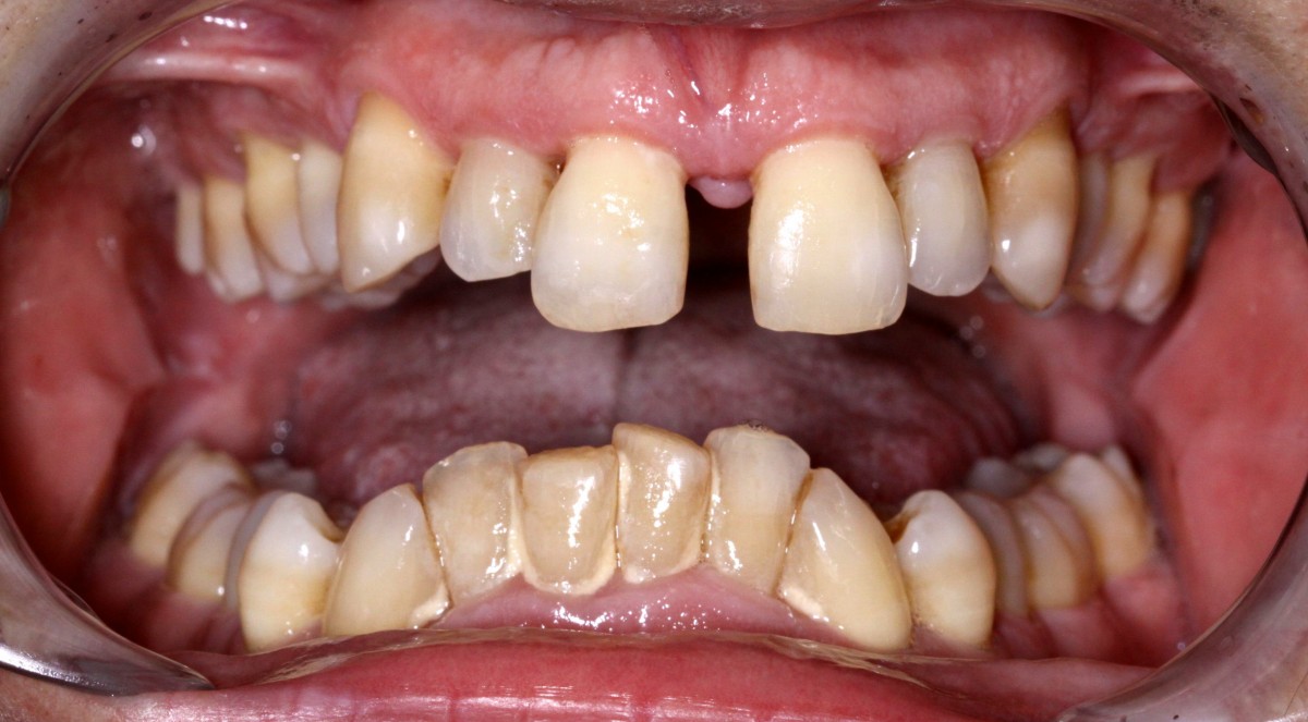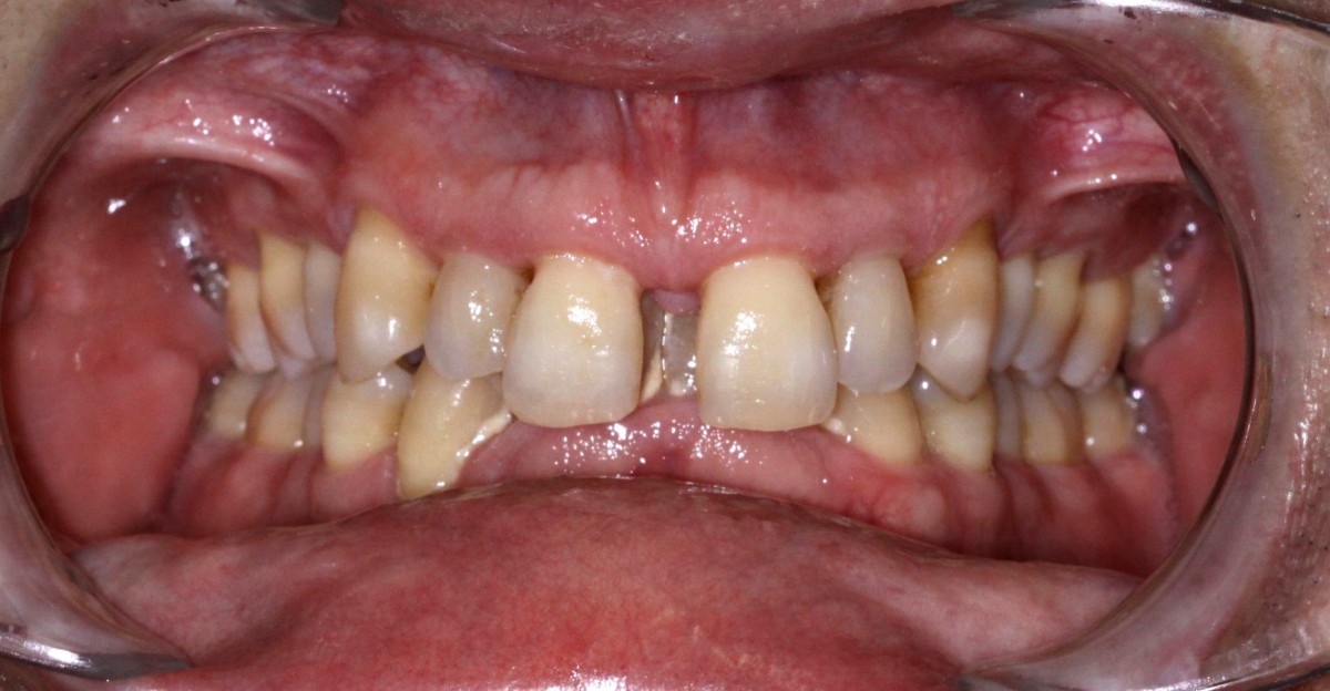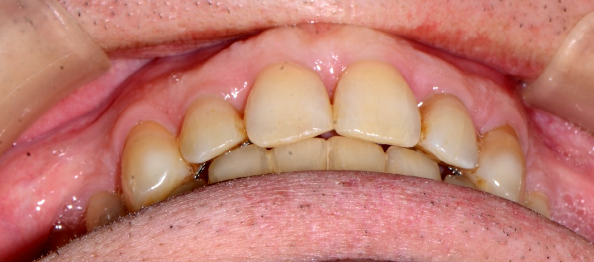 G.L., 51 years old patient, pre- sented to the clinic with Class I malocclusion, deep bite with complete coverage of lower in- cisors, big median diastema between teeth #11 and #21, lack of interdental papilla and poor oral hygiene (figs. 3, 4).