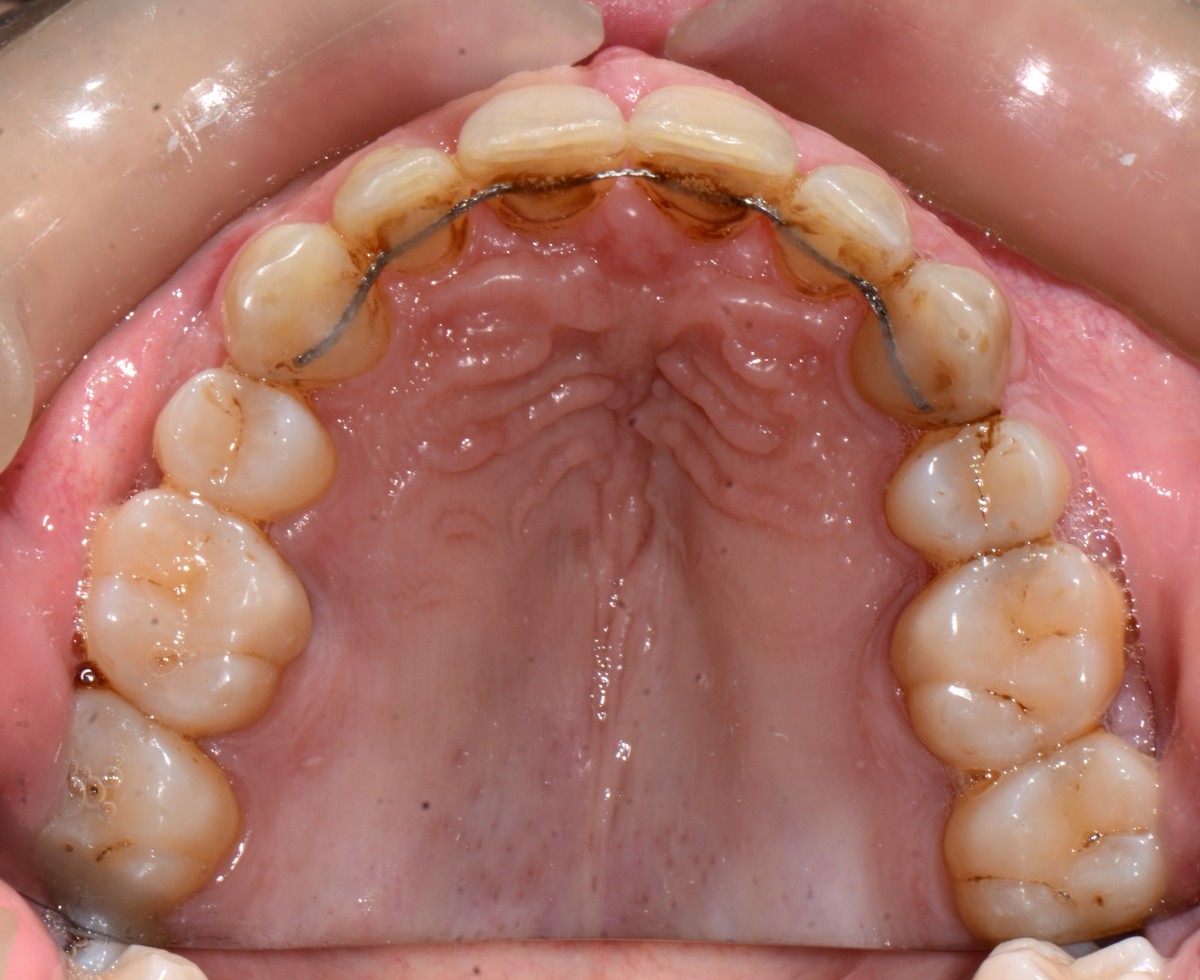 with extraction of upper first premolars (#14, #24). Space between #11-#21 is slowly opened during the years and space start to develop distally to the upper lateral incisors. Lower incisors are hitting traumatically the palate creat- ing proliferation of the epithe- lium and constant inflamma- tion. Lower anterior crowding is around 4.5 mm (#33-#43) (figs. 7, 8).