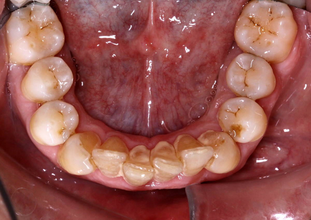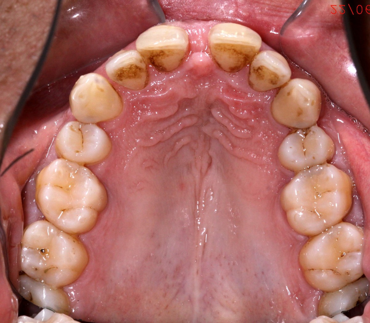 Lower incisors erupted verti- cally and created 2 planes of occlusion and exaggerated curve of spee in the lower arch. The upper lip “pushed” the an- terior incisors lingually and consequently the bite was deepened. Oral hygiene is poor mainly due to the crowding of the lower incisors. The upper diastema resulted in the loss of the interdental papilla between the central incisors (figs. 5, 6).