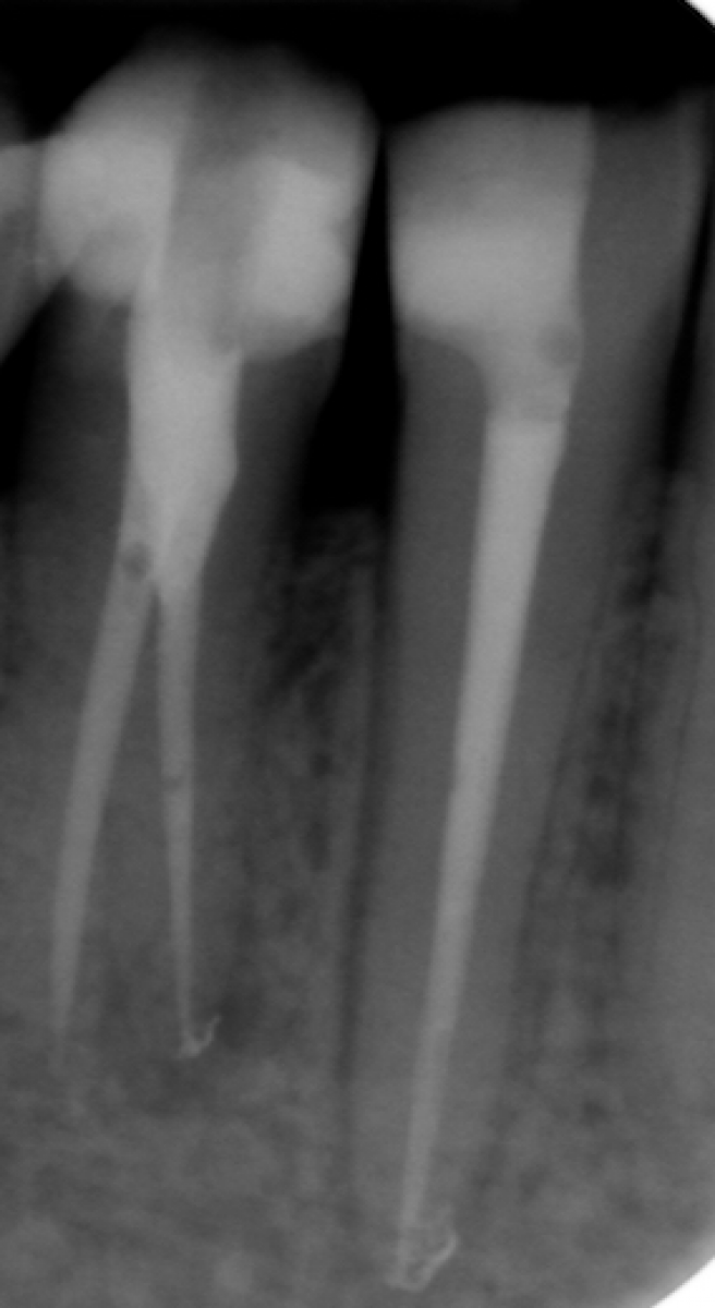 The gutta-percha point inserted into the root canal properly, adapting it to a size almost equal to the one employed to shape the apical terminus. Not wider, not smaller. Here are exposed a couple of cases made by shaping the root canal with a NiTi instrumentation technique and followed up for 9 to 12 months (Fig. 1-6).