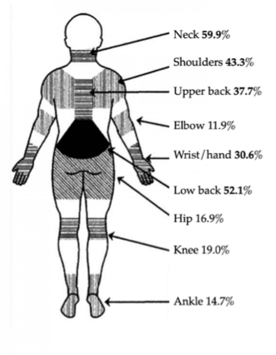 The study has been performed on a large group of dentists and dental hygienists from different Italian regions, showed that 59.9% suffer from work-related pain in the neck, 52% in the lumbar area, 43.3% in the shoulders, and 37.7% in the dorsal area. Also wrists, elbows and ankles were affected by pain problems.