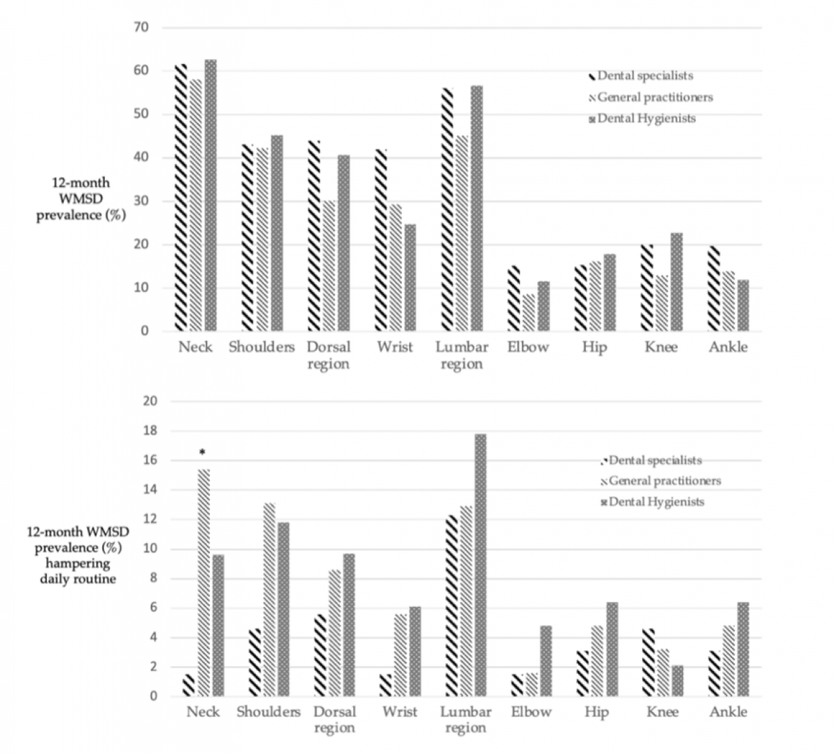 Figures from the study: Maria Giovanna Gandolfi, Fausto Zamparini, Andrea Spinelli, Alessandro Risi, Carlo Prati. Musculoskeletal Disorders among Italian Dentists and Dental Hygienists. Int. J. Environ. Res. Public Health 2021, 18(5), 2705; https://doi.org/10.3390/ijerph18052705