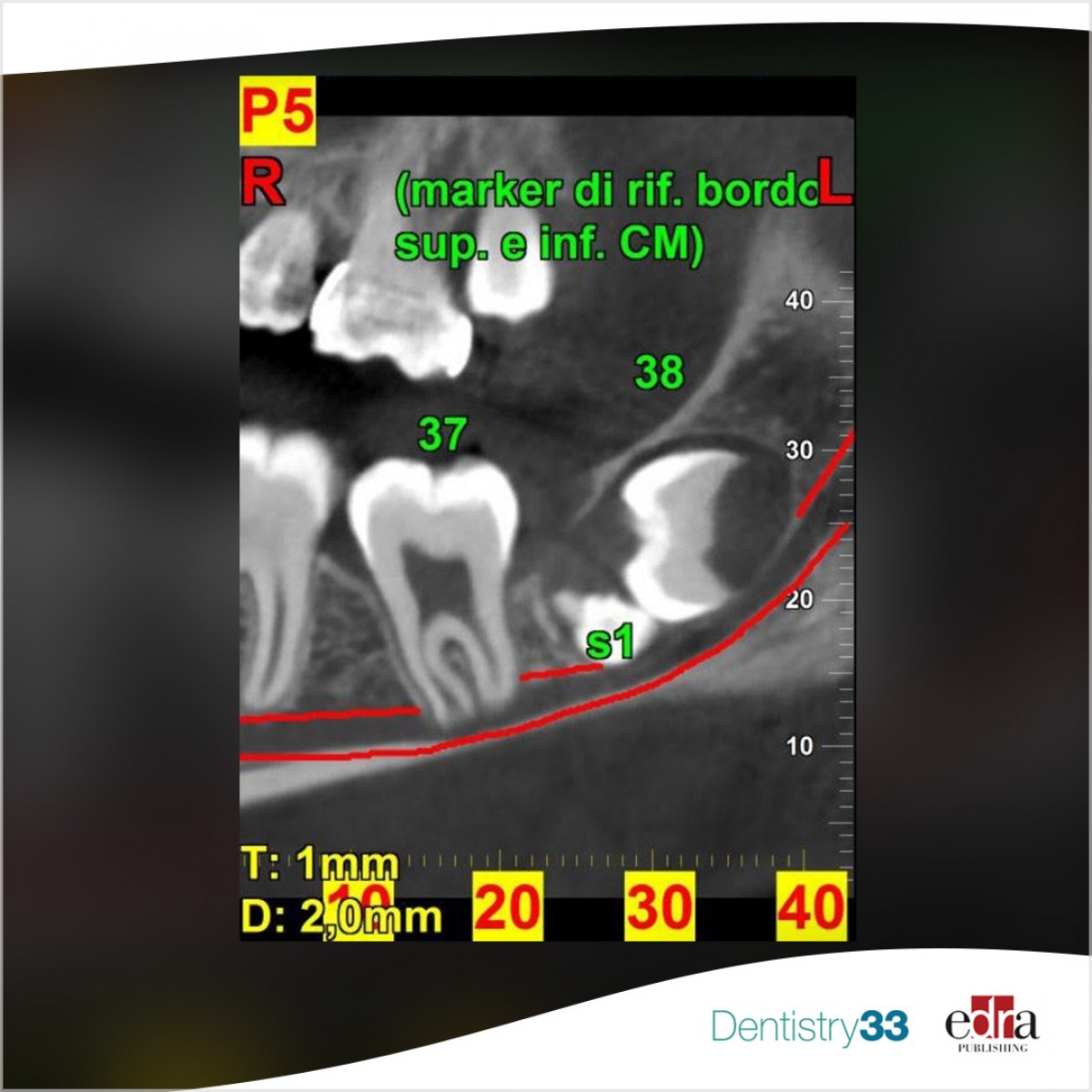 41-year-old female patient who arrived to the attention of the Department of Oral and Maxillo-Facial Surgery of the University of Bologna, after the diagnoses of inclusion of multiple dental elements. The patient reported, in the previ- ous 6 years, cyclic episodes of partial dysesthesia responsive to antiinflammatory therapy. Based on the radiologi- cal examination the element 38 and 39 were classified as III class, “true-KMs”, according to Gulses and the elements 48 and 49 were classified as “pseudo-KMs”. Considering the location of the germs, the radiological examination and the symptomatology, the surgical extraction was performed in general anesthe- sia of the “true-KMs” 38 and 39 elements. Considering the absence of symptomatology and bleeding distal to element 47, annual follow-up of “pseudo-KMs” 48 and 49 was planned.