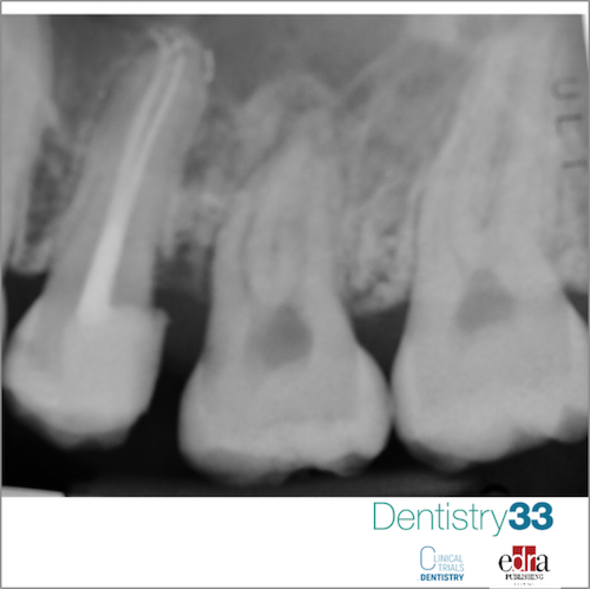After a week, excellent clinical soft tissue healing was evidenced. Both the subsequent follow-up (after 2 and 6 months) reported a positive result for the pulp vitality of the donor tooth. After 8-month follow-up, a clinical check was performed and an intraoral x-ray of the autotransplanted tooth was performed (2.8): neither symptoms nor pathological signs of the dental or periodontal tissues were communicated or detected.