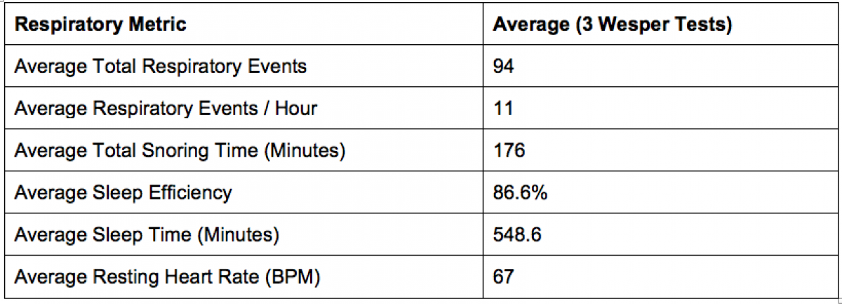 In addition to respiratory metrics, Wesper collected additional sleep metrics to demonstrate how moderate sleep apnea affected the patient’s overall sleep quality (Table 1). These metrics include sleep efficiency, sleep time, and resting heart rate (beats per minute).