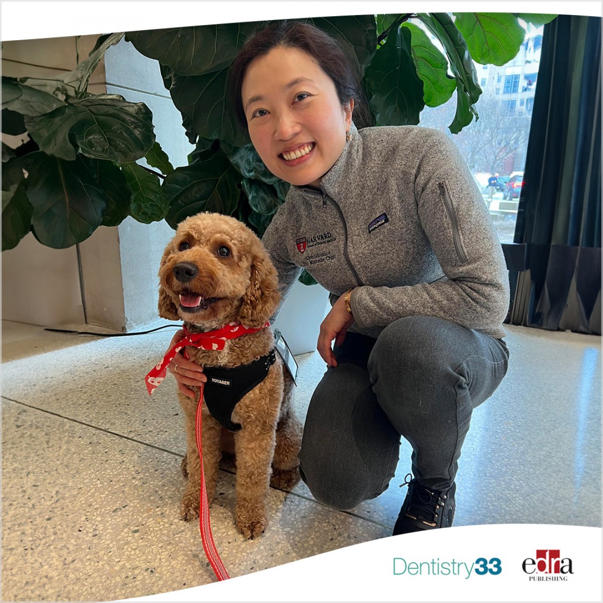 Dr. Michelle Chou and her a two-year-old miniature goldendoodle Bao are on a mission to spread joy in some of the most stressful settings. From dental office to college campus, the four-legged, curly blonde pup has wagged his way into the hearts of those who need comfort. The duo was featured recently in a news story from the Harvard School of Dental Medicine.