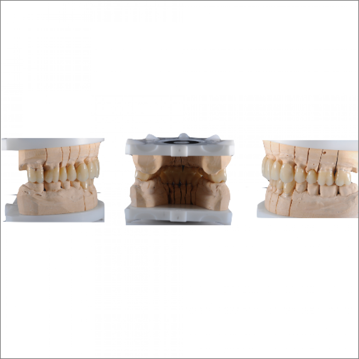 The patient showed an aesthetic result of his own pleasure, without pathological periodontal probing, both at zero time (i.e. in the cementation phase) and in a two-year follow-up. Likewise, in addition to the improvement of prosthetic crowns and gingival aesthetics, there were no visible signs of bleeding or gingival inflammation. Improvements in aesthetics were also due to the replacement of the existing metal-ceramic prostheses with new metal-free ones, to the absence of the interincisive diastema in the upper arch, to more congruous proportions of the new prosthetic crown surfaces in relation to the marginal vestibular gingiva and to the elevation of the vertical occlusion dimension (DVO) in the lower arch performed for functional and prosthetic needs.