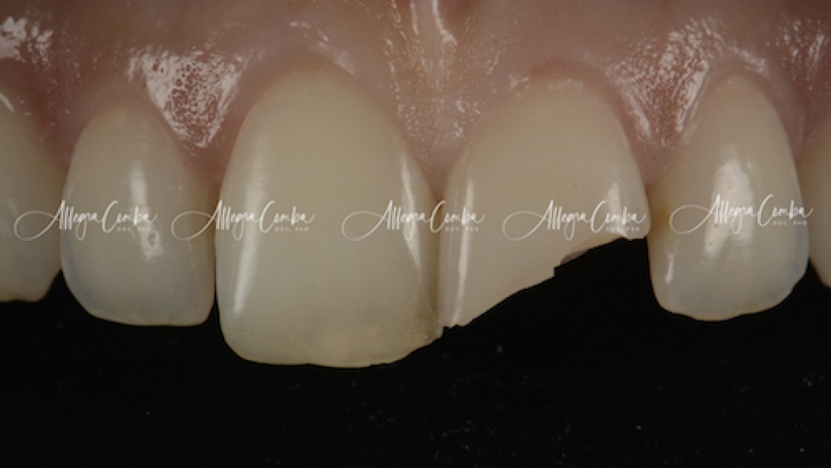 A 22-year-old female patient came to my attention after trauma involving the elements of the upper frontal sector. The patient reported having stored in water the fragment of one of the involved dental elements. The general medical history was negative.