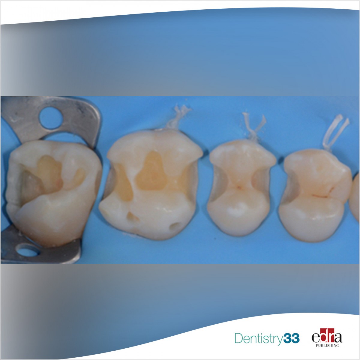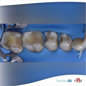 Finally, to finish the cavity preparation, the occlusal margins were finished with low-grain diamond burs mounted on a red ring contra-angle and the interproximal margins were finished and polished with low-grain diamond burs mounted on the EVA handpiece.