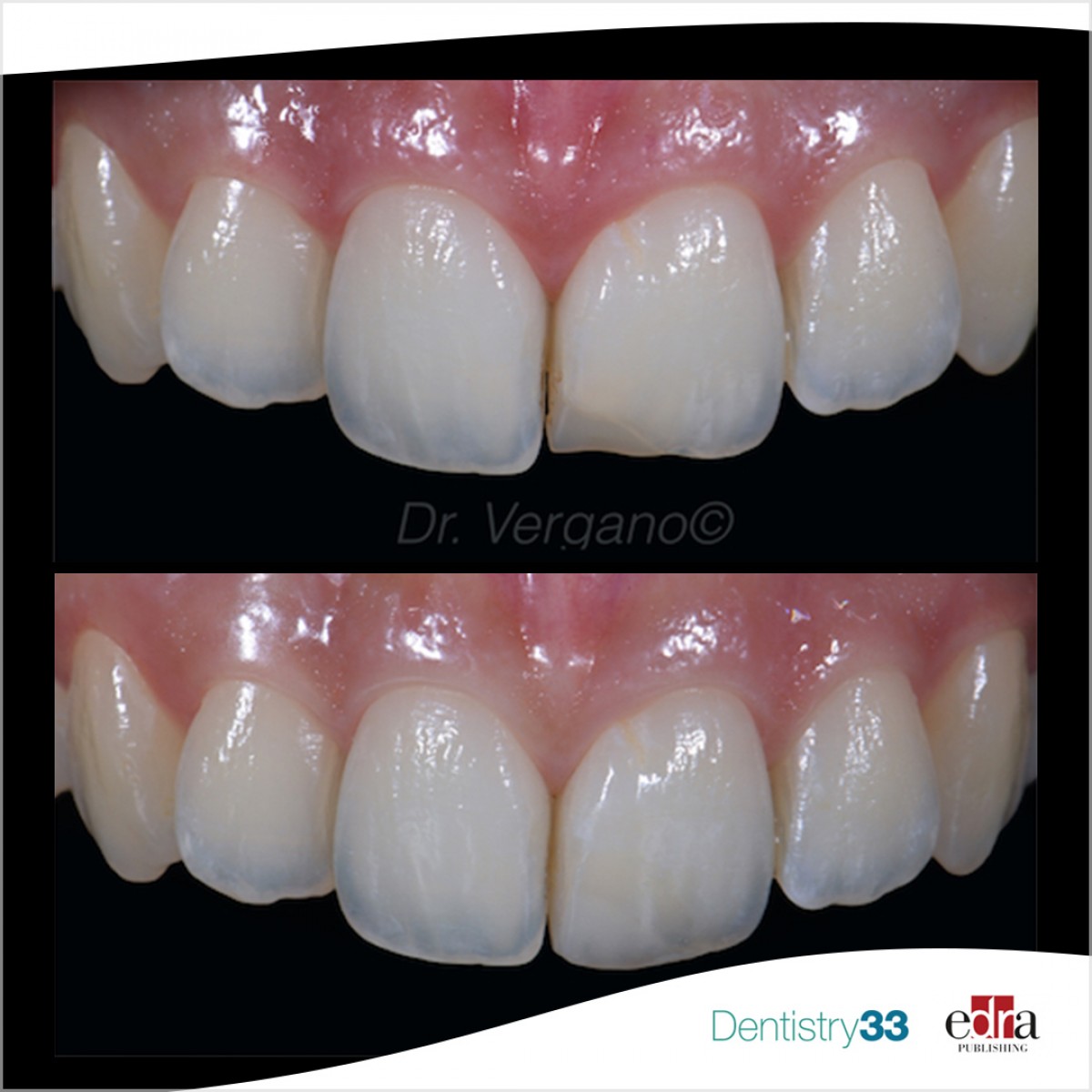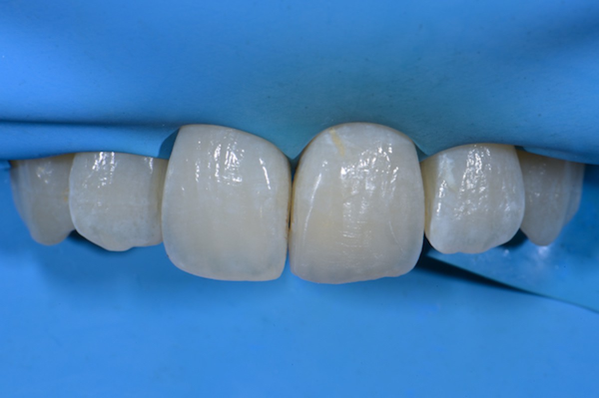 A 24-year-old female patient came to my attention with the need of esthetic improvement on 2.1, restored nearly 10 years ago, when she was a child. General medical history was negative. The oral examination detects the incorrect esthetic integration of the old restoration, showing a lower value and an incorrect form of the central incisor. A pulp vitality test was performed resulting in positive values. We therefore decided to perform a direct restoration in order to replace the older restoration.
