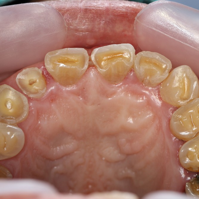 With this perspective, a clinician could manage each case with a wider approach including different disciplines in order to guarantee the best results to his patients, also in challenging situations. In this particular case it was possible to restore the upper arch in a young girl avoiding all invasive and nonreversible procedures.