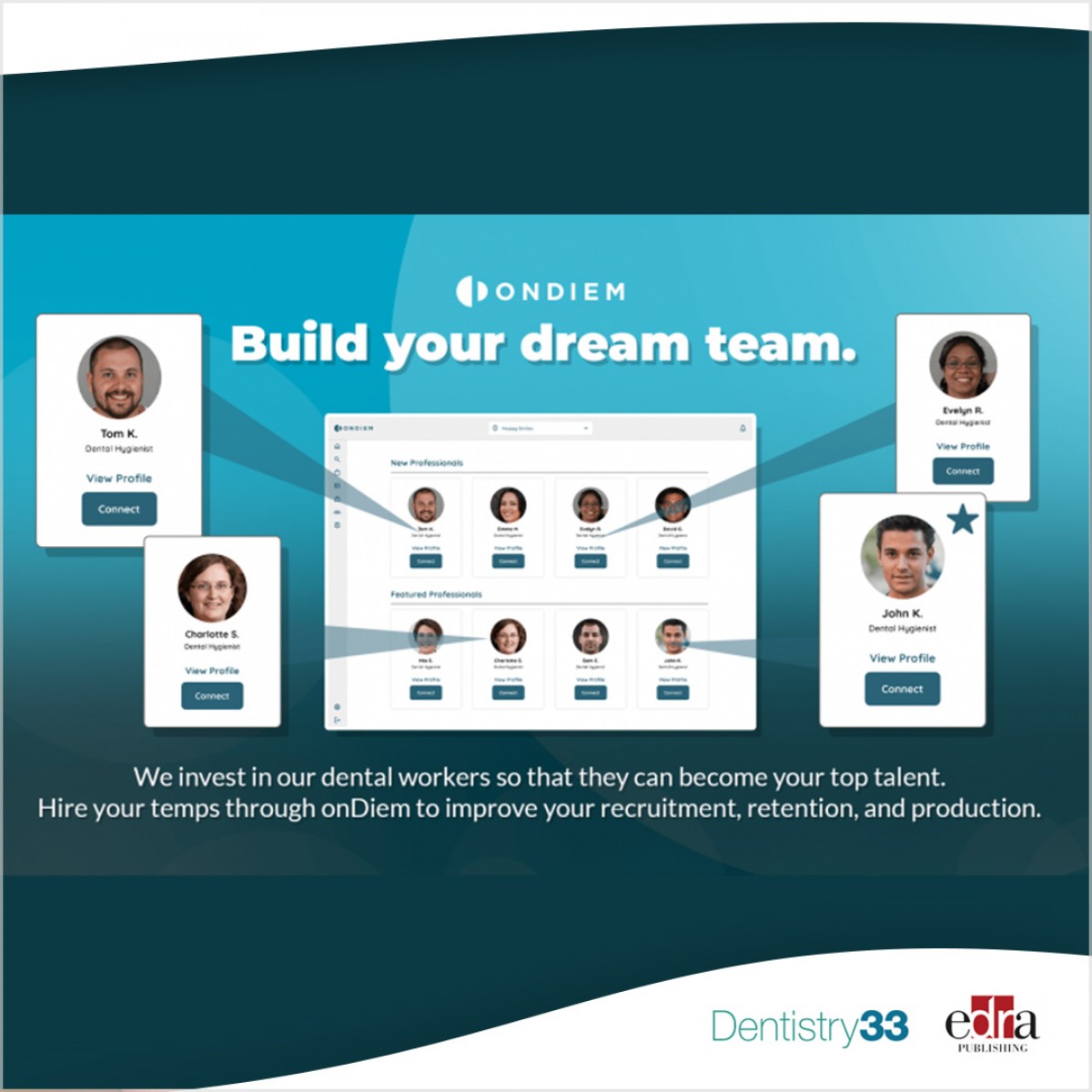 For practices and DSOs, onDiem eliminates the burden of staffing compliance and provides innovative hiring and recruitment strategies—so that dental organizations and businesses can focus on maximizing quality of care, production, and revenue. Today, the platform serves over 34,000 dental professionals and over 13,000 dental practices nationwide.