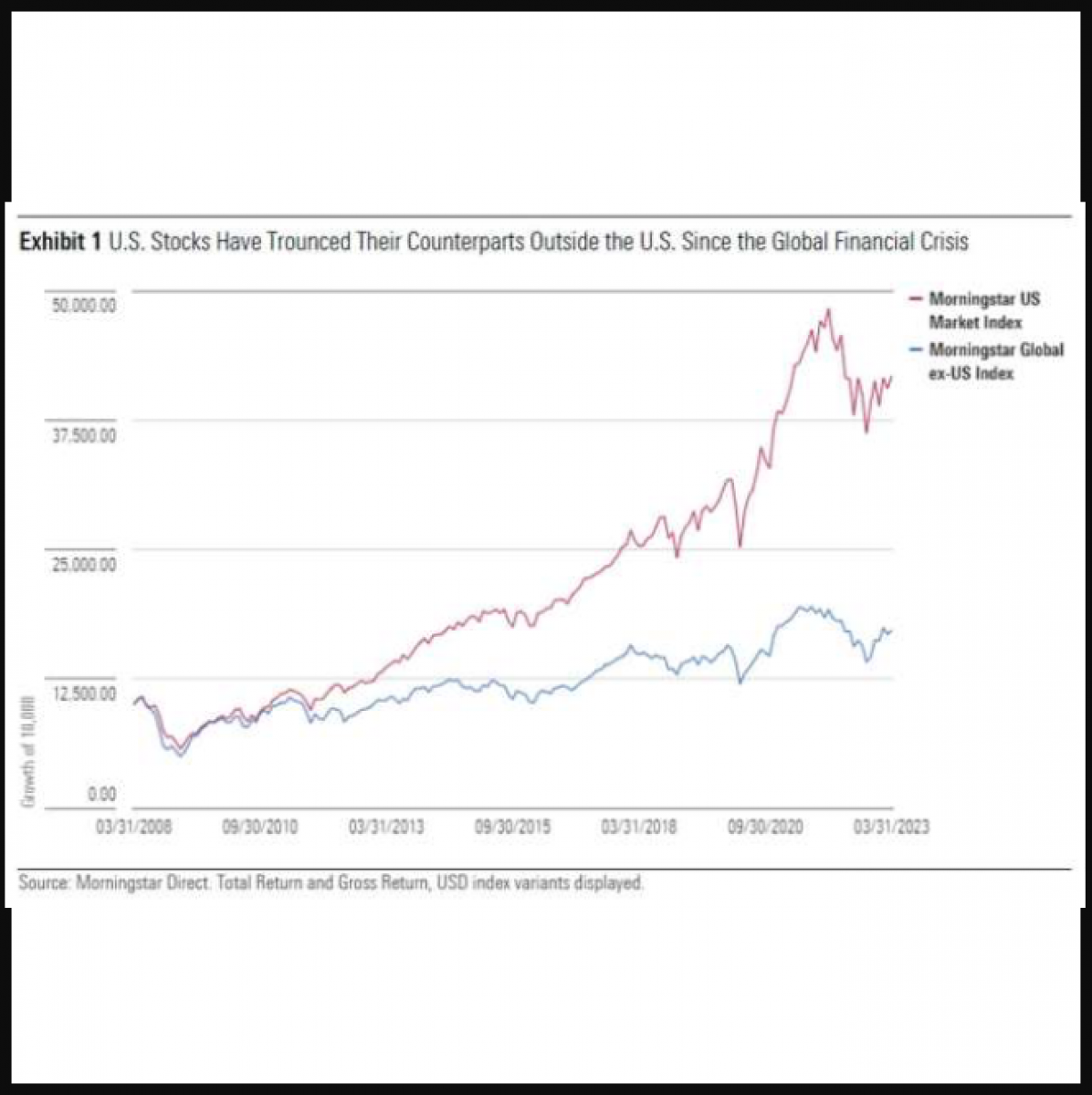 Over the past 15 years, Wall Street has dominated the global scene. The Morningstar US market index (including large, medium, and small companies) has more than quadrupled in value. The global ex-US basket (including developed and emerging markets) hasn't even doubled in value in dollar terms: $10,000 invested in the Morningstar US market at the beginning of the second quarter of 2008 would have grown to $42,000 by the end of the first quarter of 2023, whereas the same amount invested in the global ex-US index would have reached $17,200.