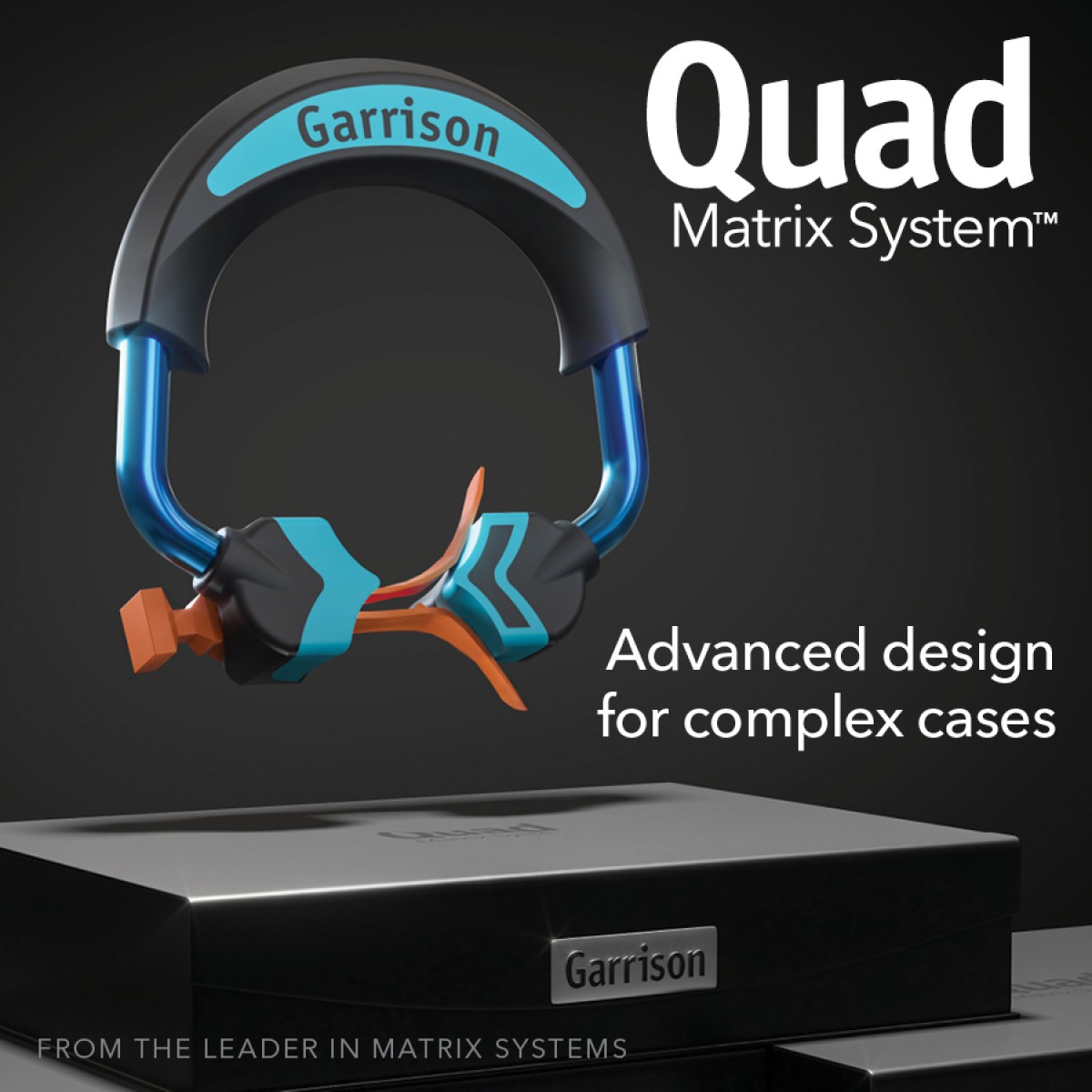 Clinicians can handle back-to-back restorations, deep caries, or multi-tooth restorations, with unparalleled precision and efficiency, states Garrison Dental Solutions. For back-to-back restorative cases, you can simultaneously restore both sides of adjacent Class IIs with confidence. Two matrix bands, one Quad Wedge, and one Quad Ring make for a streamlined workflow on this common procedure.