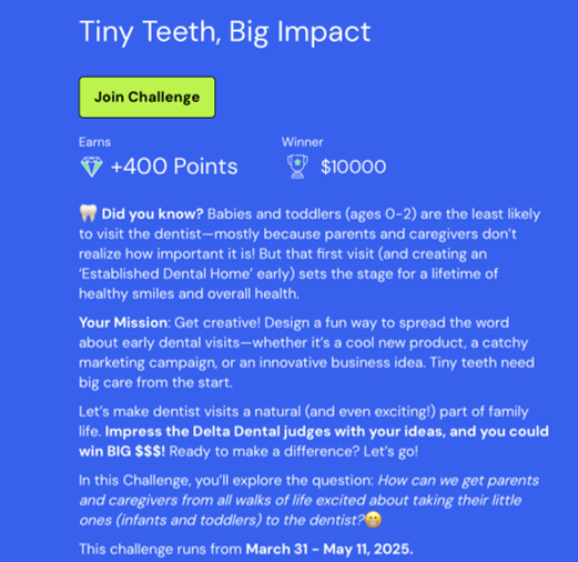 Sponsored by Delta Dental, the Dental Care for All Challenge asks students in grades 9-12 to identify creative ways to get parents and caregivers excited about taking their little ones to the dentist—whether it’s a new product, a catchy marketing campaign, or an innovative business idea. The winning students or teams will win $5,000, second place gets $3,000, and third place earns $2,000.