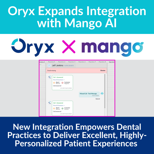 Oryx’s expanded integration with Mango Voice comes on the heels of other recent AI feature additions, including a recent integration with Overjet’s dental AI.