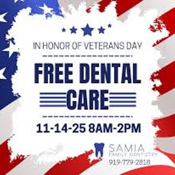 Samia Family Dentistry of Garner is proud to give back to those who have served our country by hosting a Free Dental Care Day for Veterans on Friday, November 14, 2025, from 8:00 AM to 2:00 PM.