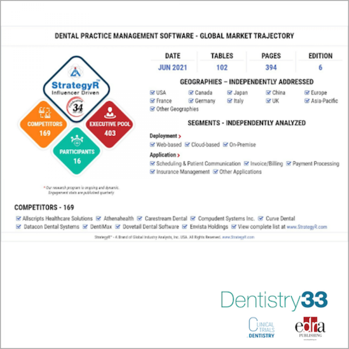 Practice management software includes business tools such as accounting, e-billing, software that allows for making appointments online, generates reports, and aids in insurance claims. The market also includes software that assists in treatment planning and mapping and dental imaging.