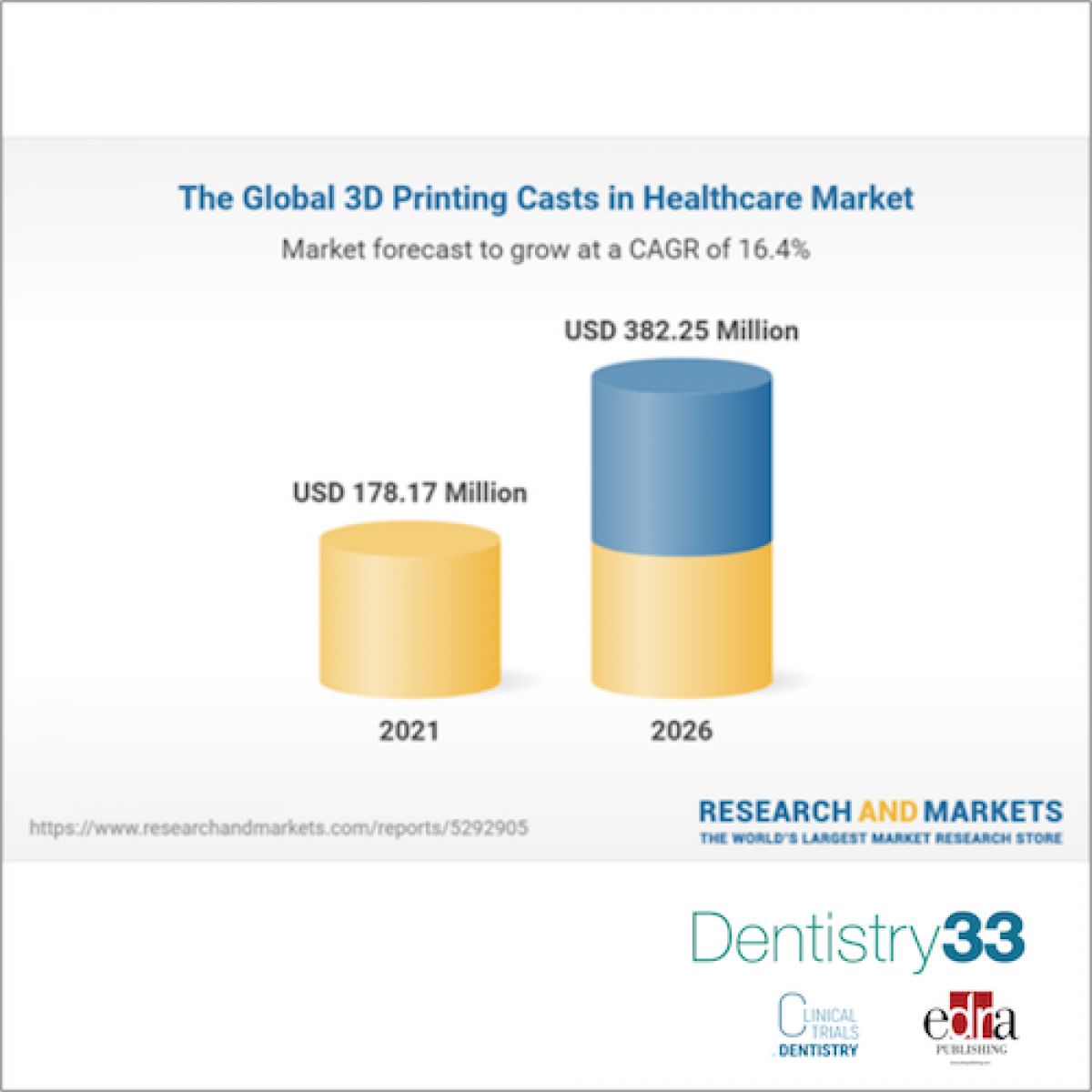 Market research analysts, ResearchAndMarkets, forecasts that the global 3-D printing casts used in the healthcare market will hit $382.25 million by 2026. The uptick marks a CAGR of 16.42% from a 2021 value of $178.17 million.