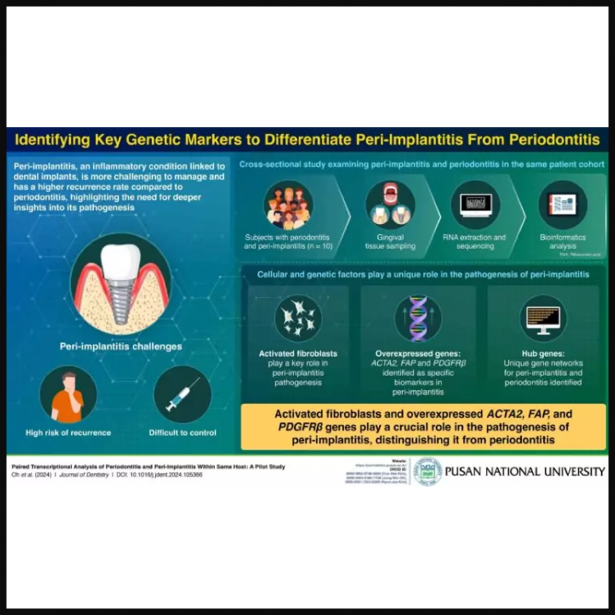 “This study provides essential insights into the role of activated fibroblasts as a distinctive factor in the pathogenesis of peri-implantitis versus periodontitis. Although peri-implantitis and periodontitis share clinical similarities, they exhibit distinct biological pathways. This research identifies three key biomarkers—ACTA2, FAP, and PDGFRβ—that are markedly overexpressed in peri-implantitis. These biomarkers have the potential to facilitate differential diagnosis and contribute to the development of peri-implantitis-specific therapeutic approaches,” explains Professor Yun Hak Kim, a lead researcher in the study.