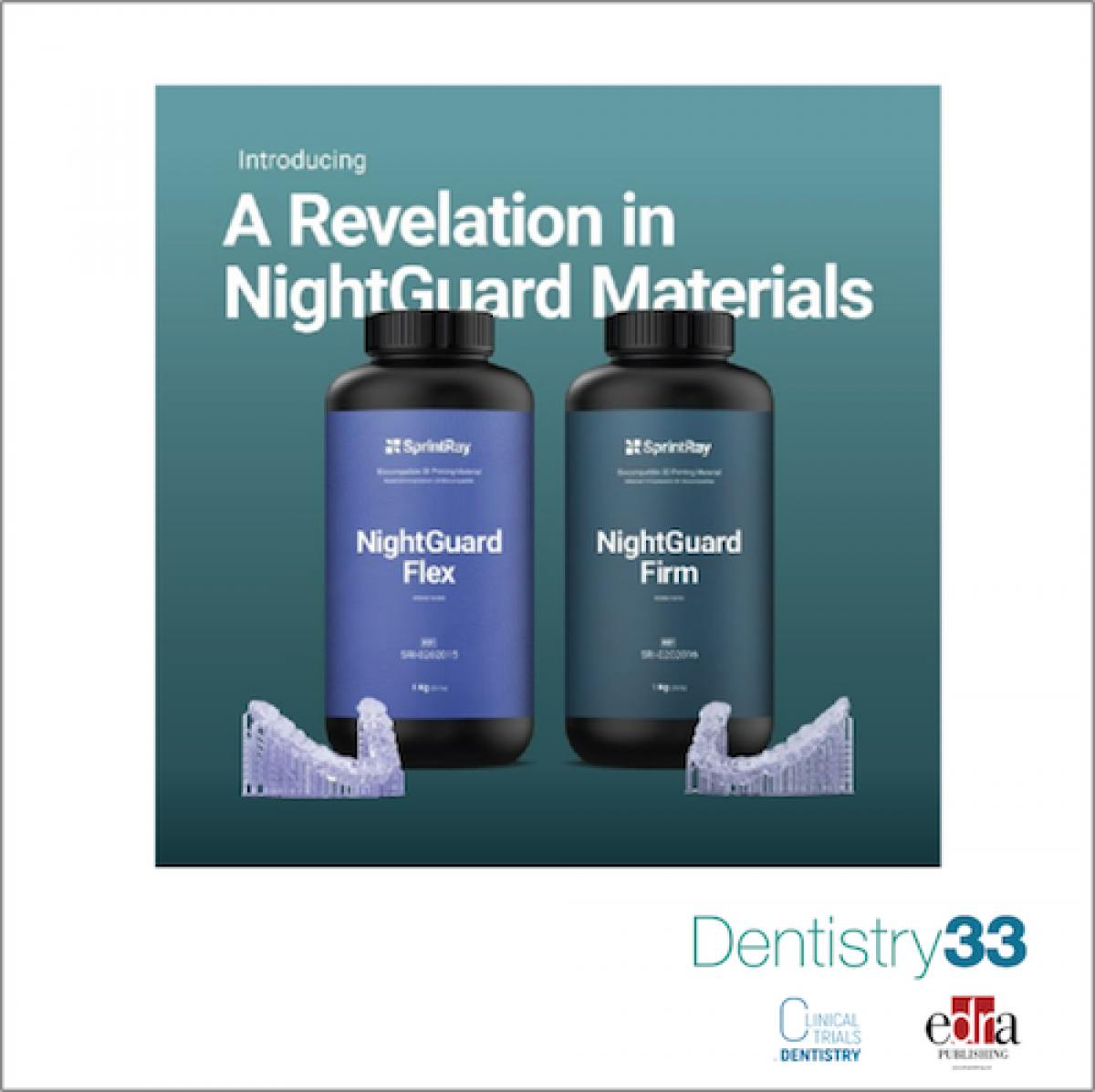 Dentistry manufacturer, SprintRay, has launched two new materials for its nightguards which can be printed in a dental office. The new resins allow dentists to design and print two types of occlusal nightguards quickly and with a cloud-based 3-D printer. In addition, the NightGuard Flex and NightGuard Firm offer two types of guards that allow dentists to create the devices quickly and maintain the related revenue within their respective offices.