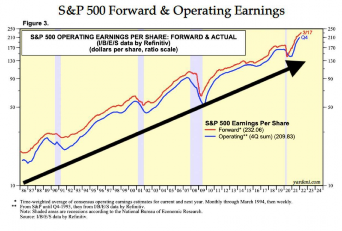 The stock market rises along with, and thanks to, the increase in corporate profits. A person invests in a company because there is a belief that that company will make a lot of money with its products or services traded in the global economy. Yardeni Research has shown over the years the earnings per share of the companies of the S&P index 500 and how they grew strongly. The stock market is made up of companies, products, services, sales, purchases and profits, just like the real economy. For this reason, it remains the most profitable investment overall.