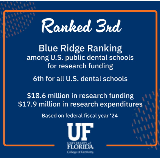 The University of Florida College of Dentistry, or UFCD, maintained its #6 rank among dental schools in the nation and #3 among public schools in total National Institutes of Health, or NIH, dental research funding. According to the Blue Ridge Institute for Medical Research, or BRIMR, which tracks all NIH funding, UFCD has been in the top 10 among dental schools every year since 2000, supporting a broad array of innovative research. The latest report from BRIMR is based on funding for the 2024 federal fiscal year, or FFY, and shows the college’s total award of $14.5 million, an increase of 4.7% since the previous year and a 33.4% increase since FFY 2020.