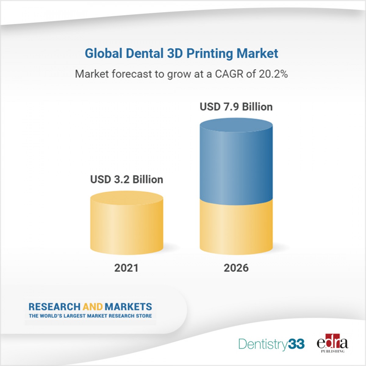The global market for dental 3D printing was forecast to reach a value of $7.9 billion across the next 5 years, according to a report by market research firm, ResearchAndMarkets.com. The sector is expected to increase to 2027 by a CAGR of 20.2% following on an increase from a value of $3.2 billion in 2022.